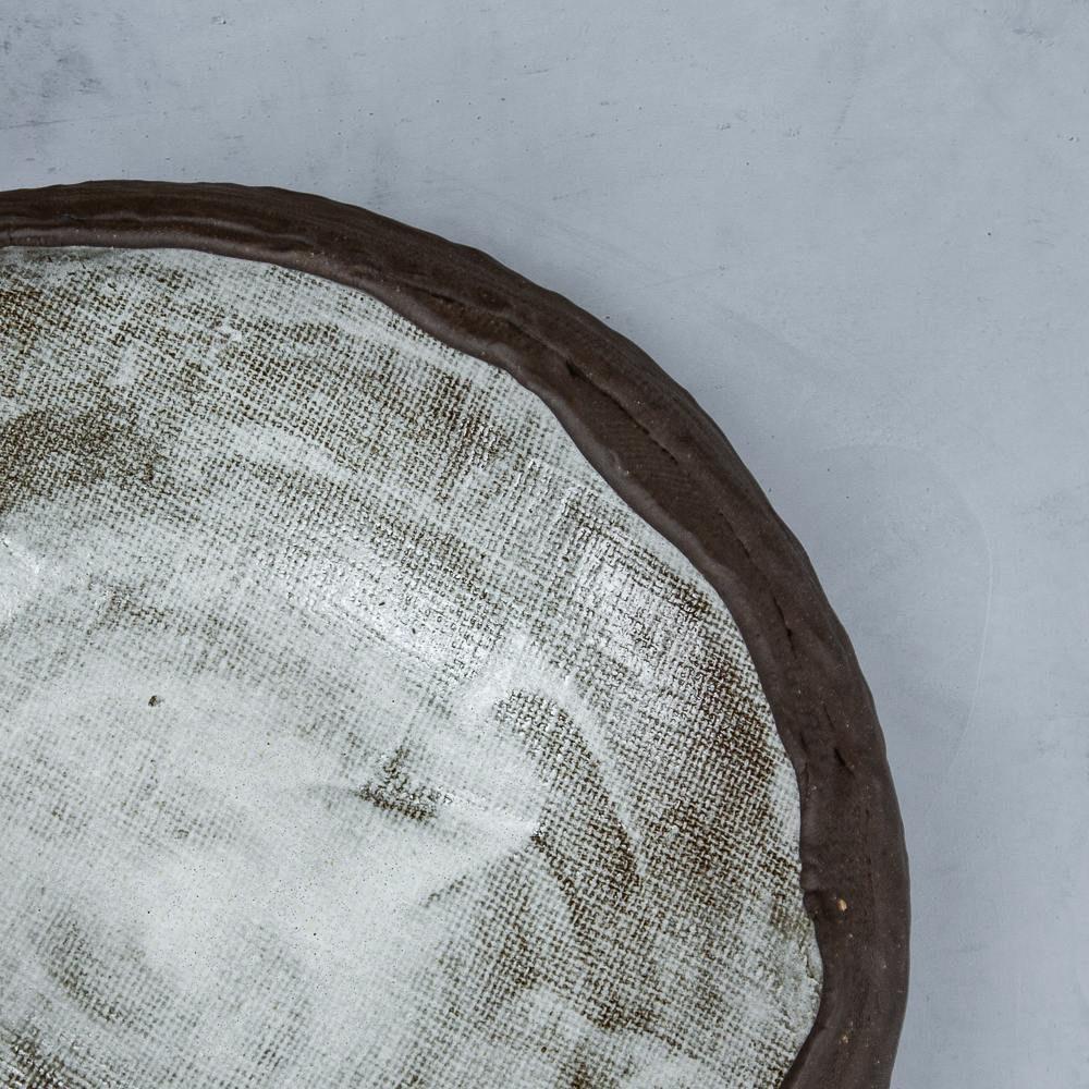 I crafted it layer by layer from black clay, slowly building the walls half an inch at a time using a pinching and layering technique. The exposed edges capture the waves as they meet the shore, while the raw exterior represents the rustic beauty of volcanic sand. Inside, a soft white glaze brings life and energy, and a subtle jute pattern adds depth, echoing the textures of the ocean floor beneath the waves — a serene interpretation of nature’s artistry captured in clay.